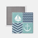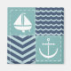 Ein inspiriertes Muster von stürmisch-türkisfarbenen Plätzen, die mit einem weißen Segelboot und Anker dekoriert sind, und die tiefmarineblauen Plätze, die mit blassblauen Chevrons und Wellen geschmückt sind, werden durch die weißen Stiche unterstrichen, um ein klassisches nautisches Ambiente zu schaffen.