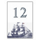 Blau-weiße Hochzeitskarte zum Thema Hochzeit in Weiß mit blauen Vintagen Bildern eines alten Segelschiffs unter amerikanischer Flagge. Personalisieren Sie die blaue Zahl für jeden Tisch am Empfang. Matching Produkte sind erhältlich.