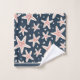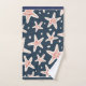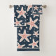 Set für das Handtuch von Starfish - Marinebad Blau & Korallenbadewanne im Badezimmer. Eine gemütliche Eleganz mit einem kühlen marinen Hintergrund mit spielerischen, korallenroten Seesternen und gepunkteten Muscheldetails. Ideal für Ozeanliebhaber, Strandhütten oder alle, die gewollt sind, ihren Alltag mit einem Schuss Meeresstil zu erfüllen.