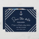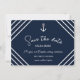 Ein klassisches marineblau-weißes Ankerdesign Save the Date perfekt für Ihre kommende Hochzeit mit dem Schiff oder dem Wassersport. Fügen Sie Ihre Hochzeitsdetails an der Vorderseite und Ihr Foto an der Rückseite. Um die besten Ergebnisse zu erzielen, schneiden Sie Ihr Foto vor dem Hochladen ab. Wenn es Ihnen schwer fällt, Ihr Foto richtig einzustellen, kontaktieren Sie mich - ich helfe Ihnen gerne.