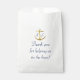 Fahren Sie mit diesen Gastgeschenk Hochzeit-Taschen mit dem klassischen Wassersport-Thema Gold und Marineblau fort. Ein goldener Anker wird mit den Mongrammen der Braut und des Bräutigams ergänzt. Der saubere, dekorative marineblau Text dankt Ihren Gästen für die Unterstützung Ihres besonderen Tages. Sie können den Text ändern und Ihre eigenen Gedanken hinzufügen.