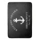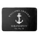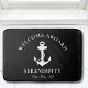 Eine schicke, moderne, nautisch geprägte schwarze Badematte für Ihr Boot, die eine weiße Abbildung eines Ankeres zeigt. Sie können den Text und das Monogramm "Welcome Abard" mit dem Namen und der Lage Ihres Bootes in eleganter weißer Typografie personalisieren.