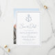 Diese elegante nautische Hochzeit sparen die Dattelkarte mit einem Ankermonogramm oben mit den Initialen der Braut und des Bräutigams, mit einem einfachen weißen Hintergrund und staubblauem Text, und einer Fotovorlage auf der Rückseite.