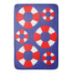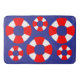 Bathroom mat with red and white life preservers arranged against a blue background.