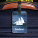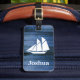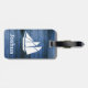 Imitate blau Holz und weiß Segelboot Silhouette Gepäckanhänger mit personalisiertem Namen in Weiß.