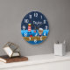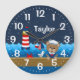 Diese niedliche und lustige Uhr kann mit einem Namen personalisiert werden. Auf einem Holzdeck mit Seemannsessel und Krabbe befindet sich ein Affe für Wassersportler. Im Hintergrund befindet sich ein roter und weißer Leuchtturm, ein niedlicher Vogel auf einem Segelboot, Meereswellen und ein marineblauer Sternenhimmel.