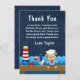Diese niedliche und lustige Dankeschön-Karte beinhaltet einen Seemann-Junge-Affen auf einem Holzdeck mit Seemannsmöwe und Krabbe. Im Hintergrund befindet sich ein roter und weißer Leuchtturm, ein niedlicher Vogel auf einem Segelboot, Meereswellen und ein marineblauer Sternenhimmel. Der Text verbindet fett- und serifenlose Schriftart für ein stilvolles und modernes Aussehen. Dies ist perfekt für eine nautische Geburtstagsfeier.