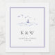 Ein einfaches, elegantes Hochzeitslabel mit Monogrammen des Ehepaares auf einem Farbdruck einer Wasserszene mit Wellen, einem kleinen Boot und Möwen sowie einem klassischen Doppelrahmen. Eine schöne Wahl für eine Hochzeit am Strand, eine Hochzeit am Strand, eine Hochzeit an der Küste, eine Hochzeit am See, eine Hochzeit am Ufer, eine Hochzeit mit einem Boot oder einer Yacht oder eine Kreuzfahrt.