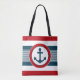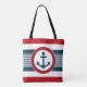 Nautical design with anchor decoration in round shape on blue, red and white striped background