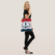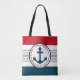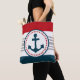 Nautisches Design mit Ankerdekoration in runder Form auf blau, rot, grau und weiß gestreiftem Hintergrund