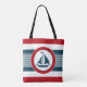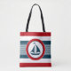 Schönes Design mit runder Dekoration der Segelboote auf blau, rot und weiß gestreiftem Hintergrund