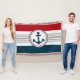 Nautisches Design mit Ankerdekoration in runder Form auf blau, rot, grau und weiß gestreiftem Hintergrund