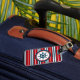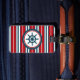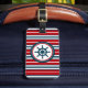 Schönes Design mit runder Dekoration der Segelräder auf rot, blau und weiß gestreiftem Hintergrund