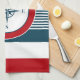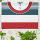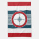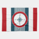 Schönes Design mit Kompassdekoration in runder Form auf blau, rot und weiß gestreiftem Hintergrund