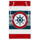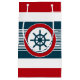 Schönes Design mit runder Dekoration der Segelräder auf blau, rot und weiß gestreiftem Hintergrund