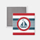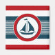 Schönes Design mit runder Dekoration der Segelboote auf blau, rot und weiß gestreiftem Hintergrund