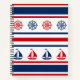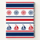 Schönes Design mit Segelboot und Kompassdekoration auf rot, blau und weiß gestreiftem Hintergrund
