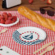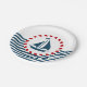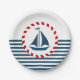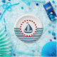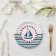Schönes Design mit runder Dekoration der Segelboote auf blau-weiß gestreiftem Hintergrund