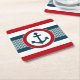 Nautical design with anchor decoration in round shape on blue, red and white striped background