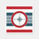 Schönes Design mit Kompassdekoration in runder Form auf blau, rot und weiß gestreiftem Hintergrund