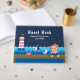 Dieses niedliche und lustige Gästebuch beinhaltet einen Seemann auf einem Holzdeck mit Seemannsrudel und Krabbe. Im Hintergrund befindet sich ein rosa-weißer Leuchtturm, ein niedlicher Vogel auf einem Segelboot, Meereswellen und ein marineblauer Sternenhimmel. Der Text verbindet fett- und serifenlose Schriftart für ein stilvolles und modernes Aussehen. Das ist ideal für eine Babydusche zum Thema Wassersport.