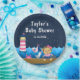 Auf dieser niedlichen und lustigen Platte befindet sich ein Seemannsmädchen auf einem Holzdeck mit einer Möwe und einer Krabbe. Im Hintergrund befindet sich ein rosa-weißer Leuchtturm, ein niedlicher Vogel auf einem Segelboot, Meereswellen und ein marineblauer Sternenhimmel. Der Text verbindet fett- und serifenlose Schriftart für ein stilvolles und modernes Aussehen. Das ist ideal für eine Babydusche zum Thema Wassersport.