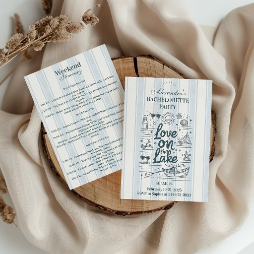 A stylish lake-themed bachelorette invitation featuring a bold nautical illustration with champagne, wine glasses, oars, and a boat — all centered around the “Love on the Lake” motif. Soft blue watercolor stripes create a breezy, coastal backdrop, while the yellow wavy border adds a playful sun-washed touch. Perfect for lake weekends, boat days, and waterfront celebrations. The matching backside includes a fully editable itinerary, making it ideal for multi-day destination parties. Personalize all text to fit your event details.