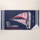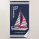 Erstellen Sie ein personalisiertes nautisch-marineblaues Badetuch für Ihren Urlaub am See. Geben Sie Ihren Familiennamen oder einen anderen Text mit der Vorlage ein. In diesem Design werden Segelbootillustrierung und Streifen sowie ein Sprichwort Life is Better am See vorgestellt.