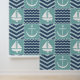 Ein inspiriertes Muster von stürmisch-türkisfarbenen Plätzen, die mit einem weißen Segelboot und Anker dekoriert sind, und die tiefmarineblauen Plätze, die mit blassblauen Chevrons und Wellen geschmückt sind, werden durch die weißen Stiche unterstrichen, um ein klassisches nautisches Ambiente zu schaffen.