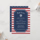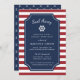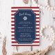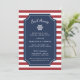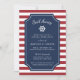 Auf der blauen, roten, weißen und weißen Probe mit einem rot-weiß gestreiften Hintergrund können Sie Ihre Veranstaltungsinformationen in Weiß auf einem marineblau-blauen Mittelelement einladen, das durch eine Darstellung der Schiffsräder hervorgehoben wird. Ideal für Probe-Dinner auf Yachten, Segelbooten oder Abendfahrten in der Marina, im Wassersportclub oder im Wassersport. Einladungen kehren zu einem Muster von winzigen weißen Ankern auf der entsprechenden marineblau.