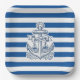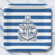 Make your party table stand out with these classic maritime-themed paper plates. The design features a bold background of alternating navy blue and white horizontal stripes that cover the entire square surface. Centered in the middle is a large, detailed anchor graphic with a flowing "Birthday" banner and two small sailboats gliding over ocean waves. This clean and coordinated look brings a fun, seafaring vibe to any birthday meal, making it easy to match with your other ocean-inspired decorations.