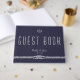 Nautic Hochzeitsgast-Buch mit weißem Anker und anpassbarem weißem Text - Sie können den Namen und das Hochzeitsdatum der Braut und Bräutigam hinzufügen, gedruckt auf marineblau Hintergrund mit Ankermuster.