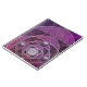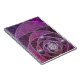 Ein farbiges Glasdesign aus silbernen Spiralen und Pflaumenfarben, über eine sich wiederholende Kulisse von spiralförmigen Fraktalen. Die silbernen Spiralen vereinigen sich in ein silbernes Rose-Design mit runden Edelsteinen für Akzente.