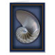 Die innere Hälfte einer Nautilus-Muschel auf einem blauen Matten-Set innerhalb eines Schattenkastenrahmeneffektes.