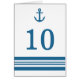 Elegante und klassische Nautical Anchor Tischnummer Card mit einem einfachen Bootanker und einer Reihe von Streifen in dunkelblau und weiß. Diese Hochzeitskarte zum Thema Wasserstrand lässt sich leicht mit Ihren Hochzeitsdetails abstimmen. Klicken Sie für weitere Anpassungsoptionen auf die Schaltfläche Anpassen.