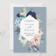 Diese stilvolle und trendige Hochzeitseinladung besticht durch einen modernen geometrischen Rahmen mit nautischen Blume in Aquarellfarbe. Die Blume Hydrangea, Peony und Anemon sind in Marineblau, hellblau und Rosa mit grünen und neutralen beigen Blätter gehalten. Der Hintergrund der Karte ist eine staubige blaue Farbe, und die Rückseite der Karte ist dunkel, navy blau.