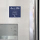 Nautische Hochzeit Sichern Das Datum Magnete mit blau-weißen Streifen, weißem Anker und veränderbarem weißem Text auf marineblau