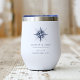 Diese schicken Küsten-Weine machen großartige nautische Brautparty Geschenke oder Gastgeschenke Hochzeiten für Ihre New England, Maine, Nantucket oder Yachtklub Hochzeit. Sauberes minimales Design mit Namen, Hochzeitstermin und Lage in klassisch marineblauen Serifenschrift. Eine Darstellung des nautischen Kompasses in Marineblau rundet das Design ab.
