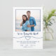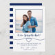 Mit diesem modernen nautischen Foto "The Bying the Knoten" Save the Date, mit einem Seilknoten in Herzform, einem eleganten, modernen Text und einem Foto des glücklichen Paares, verkünden Sie Ihr Hochzeitstag. Im hinteren Teil des Gebäudes befinden sich klassische, blaue und weiße Streifen.