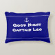 Dieses marineblau-blaue Akzent-Kissen hat einen weißen Anker oben. Unter dem Anker können Sie das blaue Kissen mit Ihrem Text personalisieren (angezeigt: Gute Nacht Captain Leo). Die Rückseite hat ein Muster von weißen Schiffsankern.