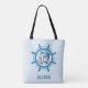 Personalisierter niedlicher nautischer Totbeutel mit niedlichem Delphin und Anker in einem Schiffrad mit einem blau-weiß Zickzack Muster-Hintergrund,