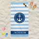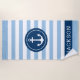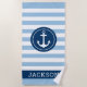 Personalisiertes Strandhandtuchdesign mit einem runden gerahmten Bootanker und individuellem Text in einfacher und moderner Serifenschrift, die mit einem Vornamen personalisiert werden kann. Das dunkelblaue Kreissdesign und der Textrahmen kontrastieren mit einem gestreiften, hellblau-weißen Hintergrund mit einem stilvollen Muster horizontaler Streifen. Farben und Schriftart-Stil können komplett angepasst werden.