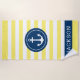Personalisiertes Strandhandtuchdesign mit einem runden gerahmten Bootanker und individuellem Text in einfacher und moderner Serifenschrift, die mit einem Vornamen personalisiert werden kann. Das dunkelblaue Kreissdesign und der Textrahmen kontrastieren einen gelb-weiß gestreiften Hintergrund mit einem stylischen Muster horizontaler Streifen. Farben und Schriftart-Stil können komplett angepasst werden.
