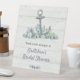 Dieses Tafelschild zeigt einen grauen Aquarellanker mit blauen, lila und weißen Blume. Ein verwitterter weißer Holzfußboden setzt das Wasserthema fort, und ein zusätzlicher Strauß wird als Dekor hinzugefügt. Ideal, um Ihre Gäste bei einem nautischen oder ozeanorientierten Brautparty, einer Hochzeit, einer Verlobungsfeier, einer Geburtstagsfeier, einem Probe-Dinner oder einer Jubiläumsfeier willkommen zu heißen oder als Informationszeichen bei einer Veranstaltung zu nutzen. Verfügbar mit passenden Produkten.