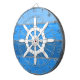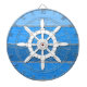 Nautisches Design mit Segelraddekoration auf blau gestreiftem und grauem Holzboden. Bitte beachten Sie, dass dies nicht aus Holz ist, es ist eine Holzgrafik.