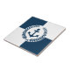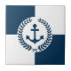 Nautisches Design mit Anker- und Lorbeerkraendekoration über blau-weißem geometrischem Hintergrund