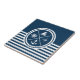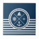Nautisches Design mit nautischen Symbolen (Anker, Segelboot, Segelrad, Kompass) Dekoration auf weißem und marineblauen Streifen Hintergrund.