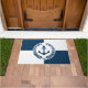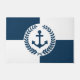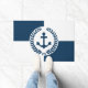 Nautisches Design mit Anker- und Lorbeerkraendekoration über blau-weißem geometrischem Hintergrund