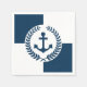 Nautisches Design mit Anker- und Lorbeerkraendekoration über blau-weißem geometrischem Hintergrund