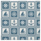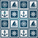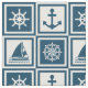 Nautisches Design mit Segelrad, Segelboot, Kompass und Ankerdekoration in weiß-blau gestreiften Quadraten